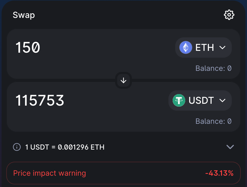 <figure><img src="https://3888549809-files.gitbook.io/~/files/v0/b/gitbook-x-prod.appspot.com/o/spaces%2FHQwvYO2d3c8YPJCH1Rxl%2Fuploads%2Fgit-blob-7849487cbf240fa6909232f0fb11670f2e3f461a%2FScreenshot_2022-10-06_at_11.54.08.png?alt=media" alt=""><figcaption><p>"large" swap causing an enormous price impace</p></figcaption></figure>